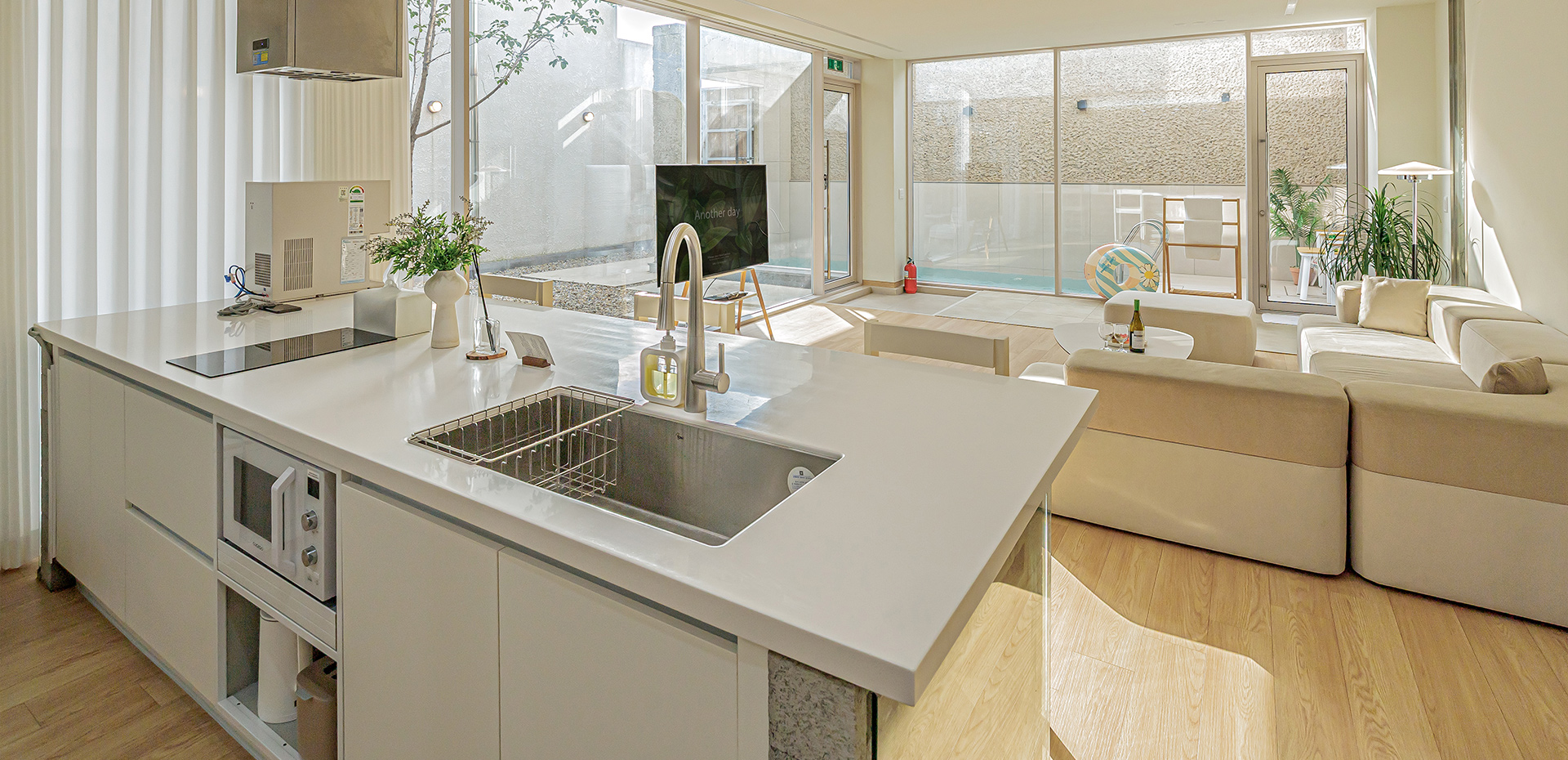 TV, 냉장고, 정수기, 밥솥, 전자렌지, 전기포트, 인덕션 2구, 각종 조리 도구, 공기청정기, 드라이기, 샴푸, 린스, 바디워시, 치약, 전기 그릴, 와인잔