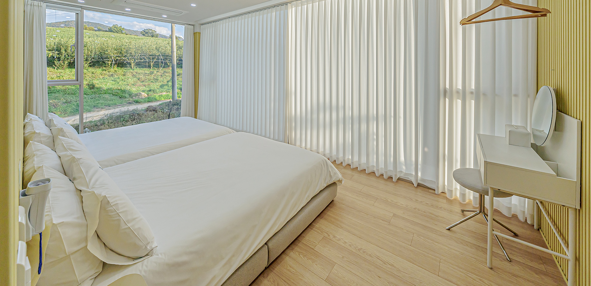 침대룸A(더블2) + 침대룸B(더블2) + 화장실2 + 거실1, 34평(약 113.0㎡), 복층, 테라스바베큐가능, 독채, 개별수영장